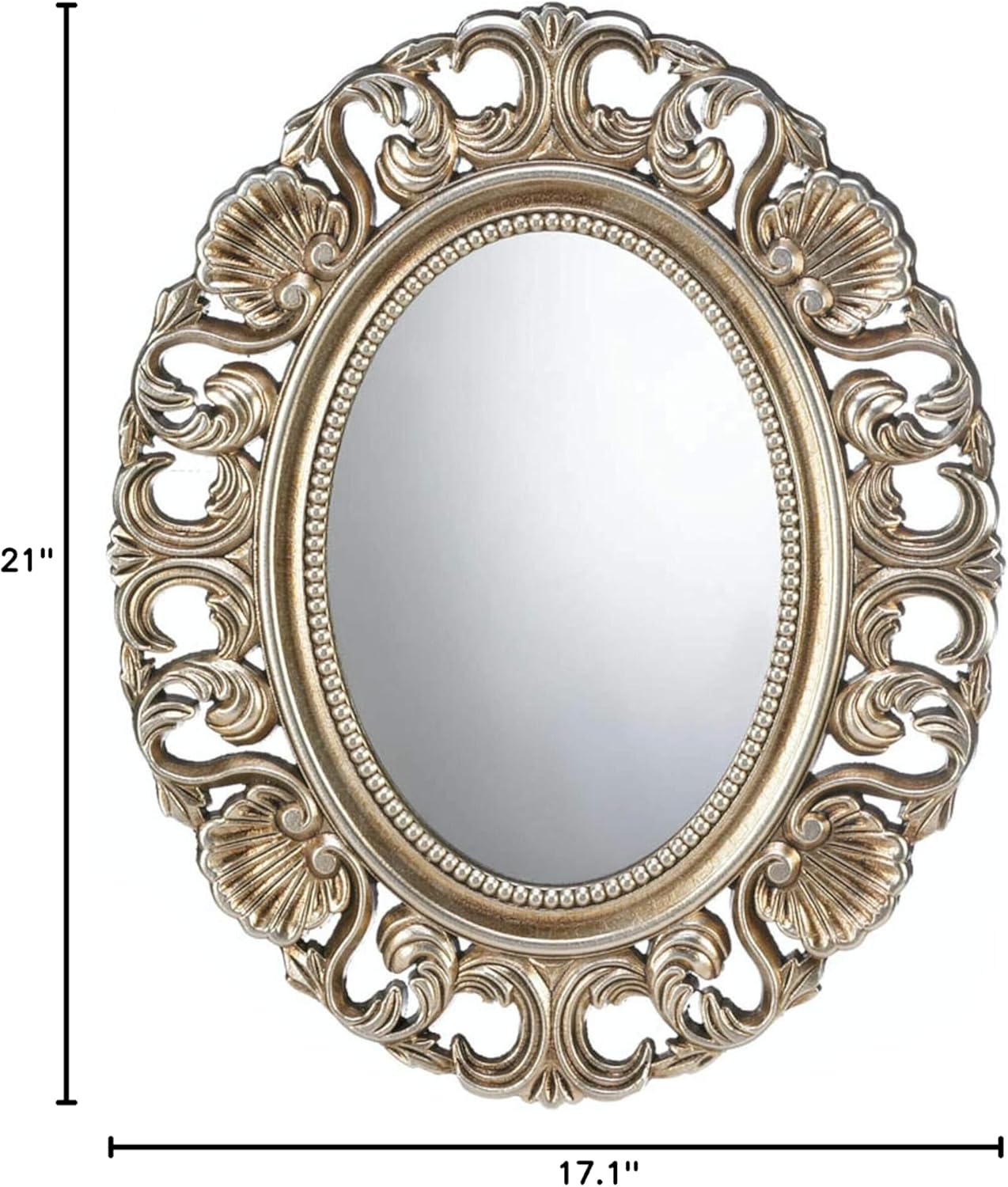 This gorgeous oval wall mirror is the perfect blend of classic beauty and timeless style. Ornate frame has a gilded golden finish. Weight 4 pounds. 17.1 x 20.7 x 21 inches tall. Mirror: 8.5 x 12.5 inches tall. Wood frame. UPC 849179022747